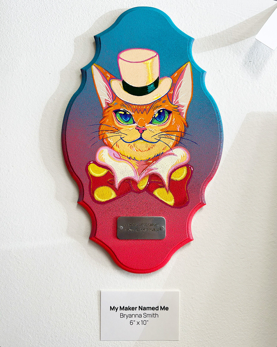 Acrylic, Spray Paint, and Engraved Metal on Cut Wooden Board